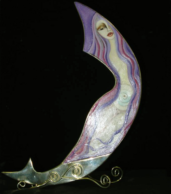 Ines Villanueva has an innovative and distinctive method in which she combines different media and techniques. She paints symbolic representations of female fertility and ancestral sacred beliefs. She drenches warm bold color over canvases, jewelry and clothing.